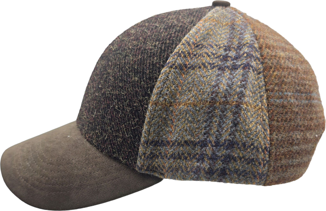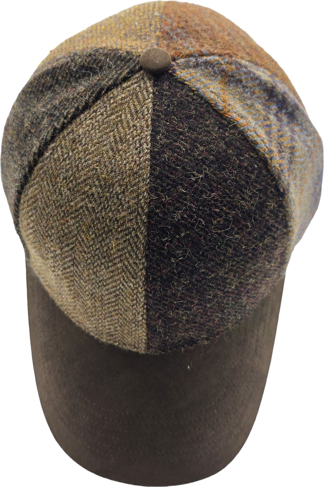 Stylish patchwork baseball cap made from a wool-blend fabric, featuring a suede peak and adjustable buckle for a comfortable fit.