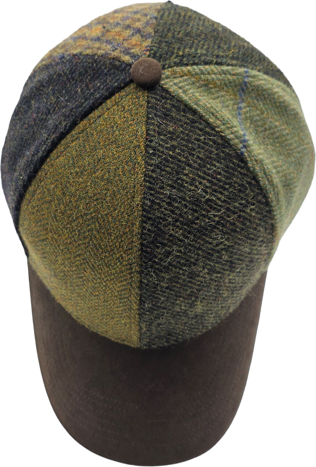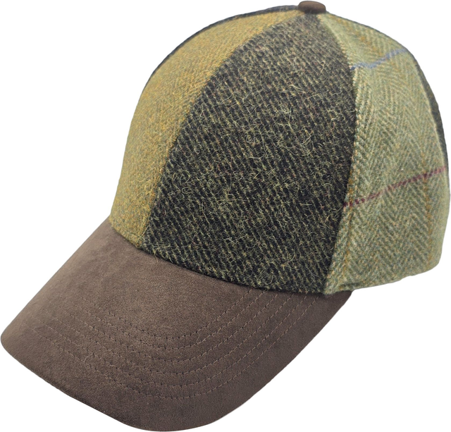 Stylish patchwork baseball cap made from a wool-blend fabric, featuring a suede peak and adjustable buckle for a comfortable fit.